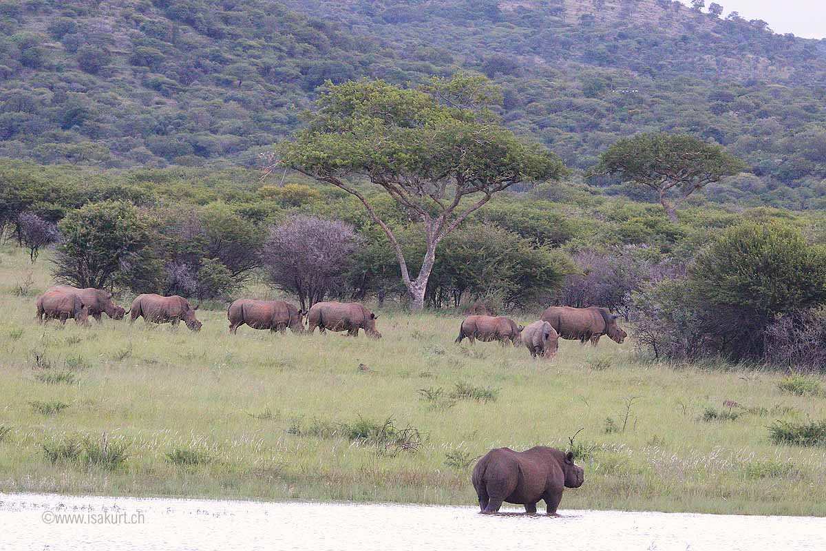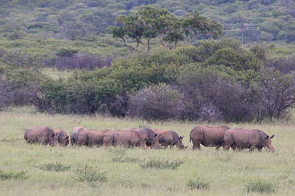 différents oiseaux, lorsque j'aperçois le groupe de neuf rhinos blancs