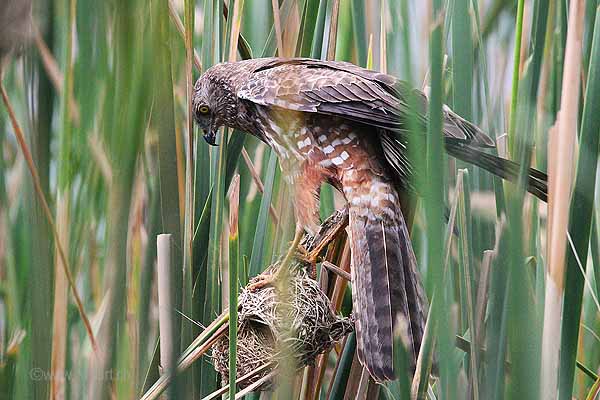 Busard grenouillard qui cherche à attraper des oisillons tisserins -