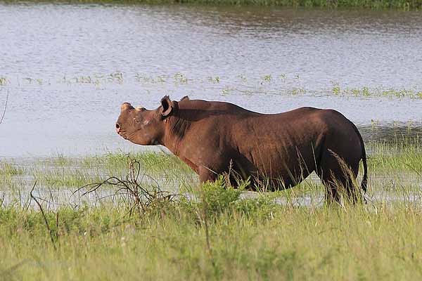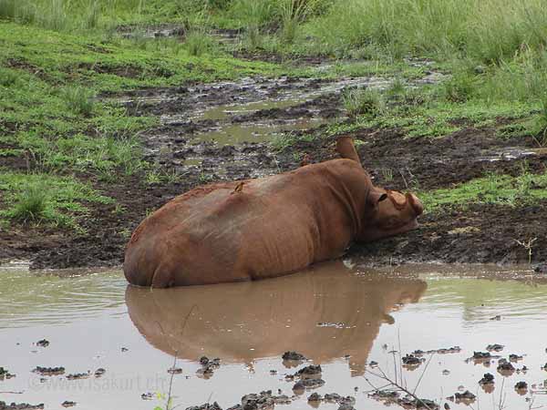 Depuis ce point, j'observe un bon moment ce rhino noir qui prend son bain du soir, ainsi que