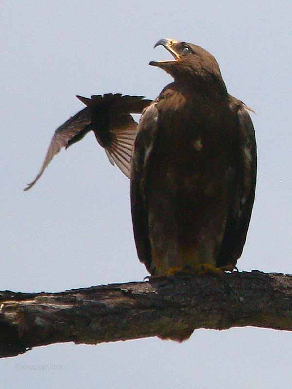 Aigle (pomarin?) qui se fait attaquer par un drongo