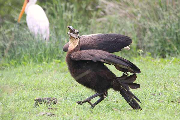 Jeune Bucorne du Sud qui se fait attaquer par un vanneau, car il cherche à voler ses oeufs (nids au sol)