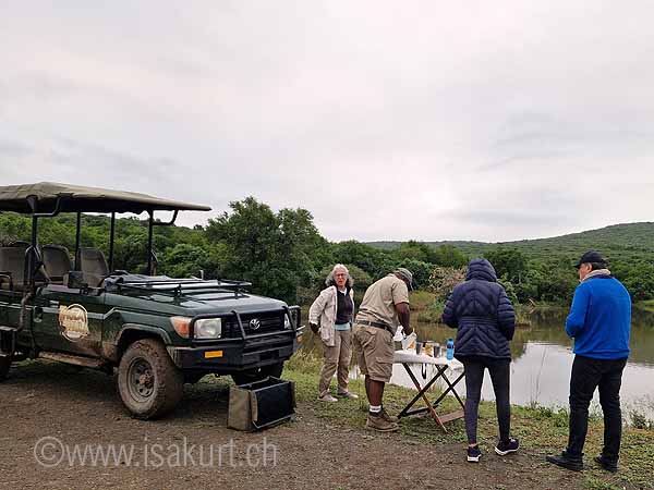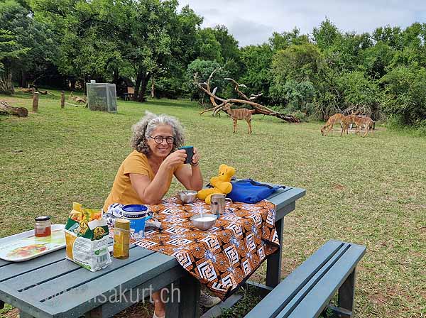 La deuxième journée, dans le parc de Hluhluwe, nous prenons le petit-déjeuner dans un bel emplacement, prévu à cet effet, entouré par des nyalas.